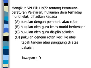 . Surat pekeliling ikhtisas bilangan 16 tahun 2010 pelaksanaan dasar satu muri. SPI Bil 72013 - Kuasa Guru Merotan Murid. SPI Bil 22009 - Penguatkuasaan Larangan Membawa Telefon Bimbit oleh Murid di Sekolah.