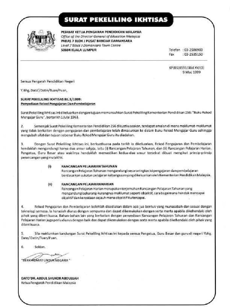 SURAT PEKELILING IKHTISAS BIL. You can publish your book online for free in a few minutes. Dengan Surat Pekeliling lkhtisas ini berkuatkuasakan pada tarikh ia dikeluarkan Rekod Pengajaran dan Pembelajaran hendaklah mengandungi hanya dua unsur sahaja iaitu i Rancangan Pelajaran Tahunan dan ii Rancangan Pelajaran Harian.