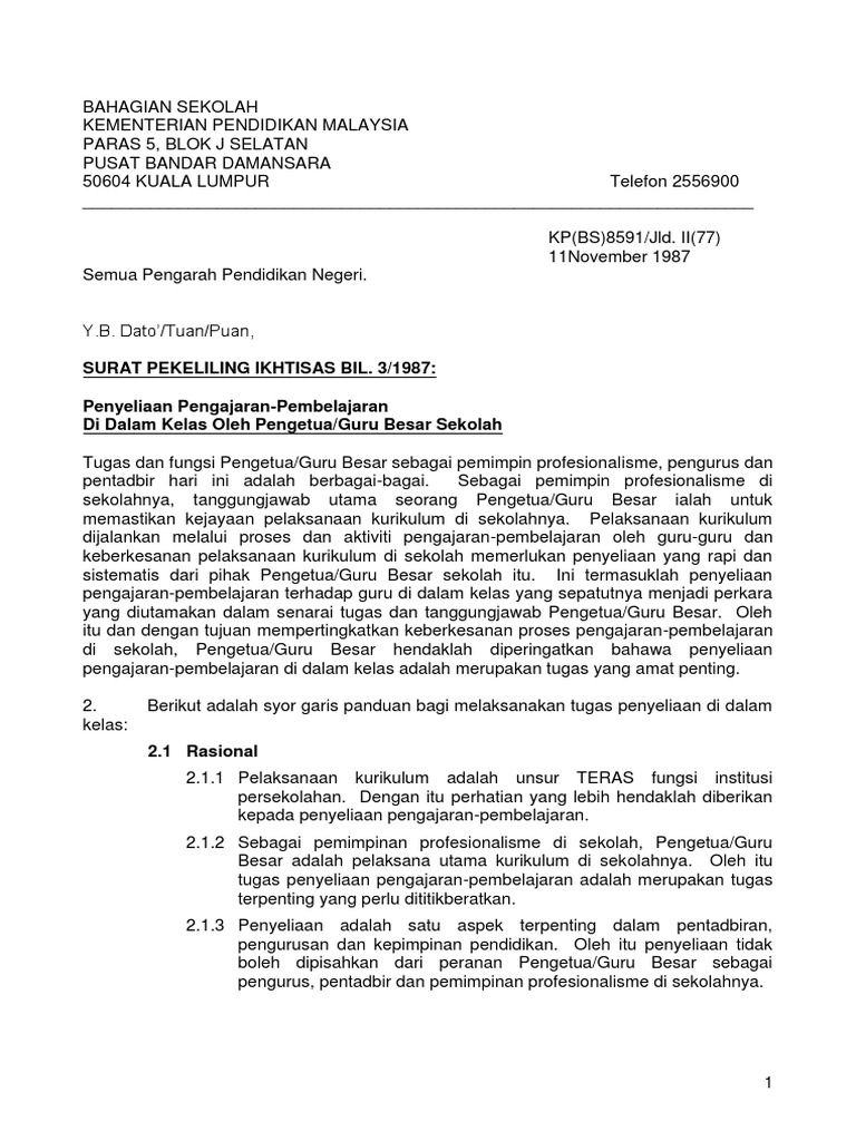 View 378 Download 32 Facebook. Pengetua Guru Besar atau wakilnya hendaklah memastikan kedua-dua unsur tersebut dibuat mengikut. Interested in flipbooks about Surat Pekeliling Ikhtisas Bil 3 1987 Penyeliaan PdP oleh GB.